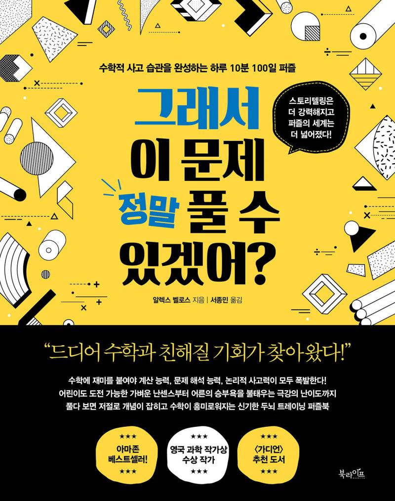 최고의 퍼즐북이라는 찬사를 받으며 퍼즐 마니아들에게 짜릿한 희열을 선사했던 《이 문제 풀 수 있겠어?》의 저자 알렉스 벨로스. 퍼즐 마스터이자 영국 과학 작가상을 수상한 영국 대표 대중 수학자인 그가 《그래서 이 문제 정말 풀 수 있겠어?》로 다시 우리를 찾아왔다. 이번에도 수학 퍼즐 100개를 붙들고 있다 보면 두뇌를 쥐어짜는 듯한 고통과 쾌감을 제대로 느낄 수 있을 것이다. 그 과정에서 저절로 수학 개념이 잡히고 수학이라는 학문이 흥미로워지는 경험도 할 수 있다.